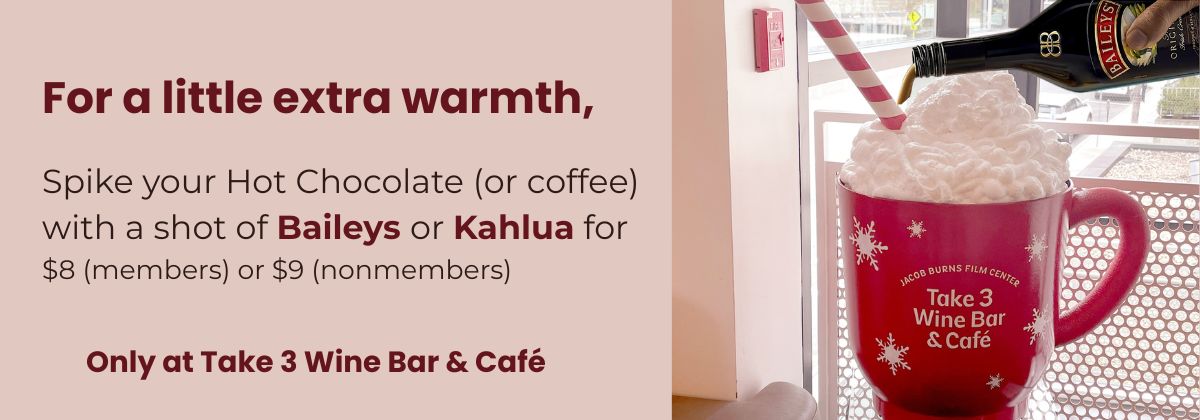 Snap a photo with our Giant Mug of Hot Chocolate (handmade by JBFC staff!), then treat yourself to a Gourmet Hot Chocolate at Take 3 Wine Bar & Café. Delicious and cozy, steamed milk hot chocolate with fresh, house made whipped cream, topped with chocolate shavings. $7.00 nonmember/$6.25 members. Spike your Hot Chocolate (or coffee) with a shot of Baileys or Kahlua for $8 (members) or $9 (nonmembers).